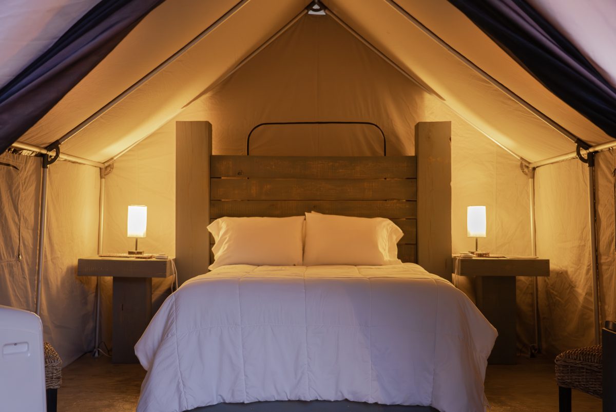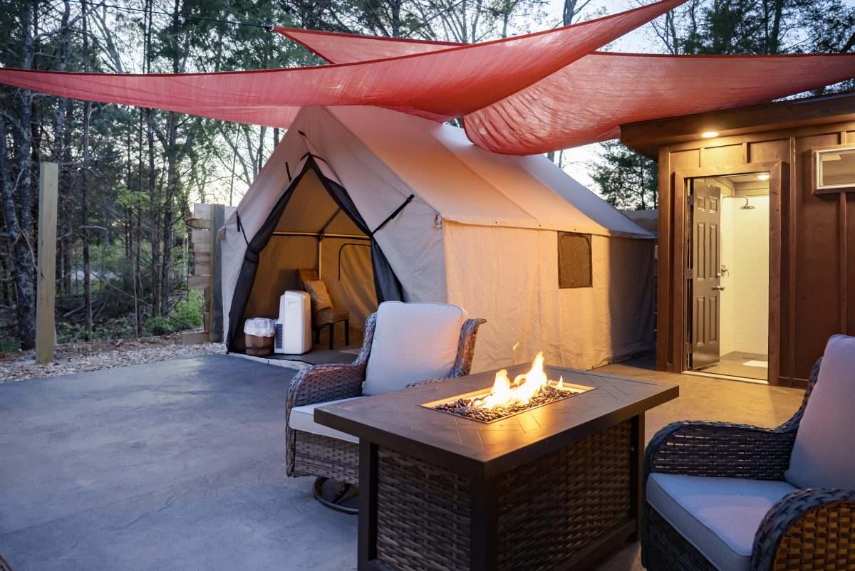 You will be able to enjoy the great outdoors under the stars in a safari tent, equipped with one queen size bed, heating/ac unit, mini fridge and microwave, with a full restroom facility located just outside of the tent.